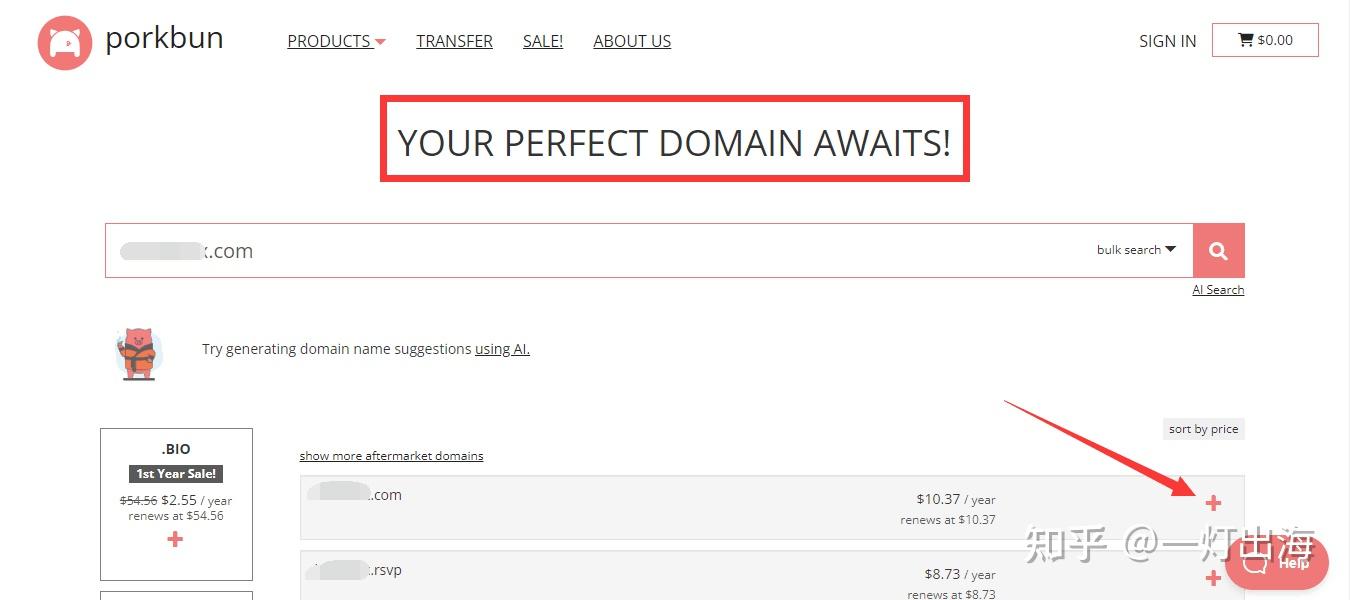 如果显示 YOUR PERFECT DOMAIN AWAITS,恭喜你!这个域名还可以注册,点击 + 号添加到购物车 Checkout。