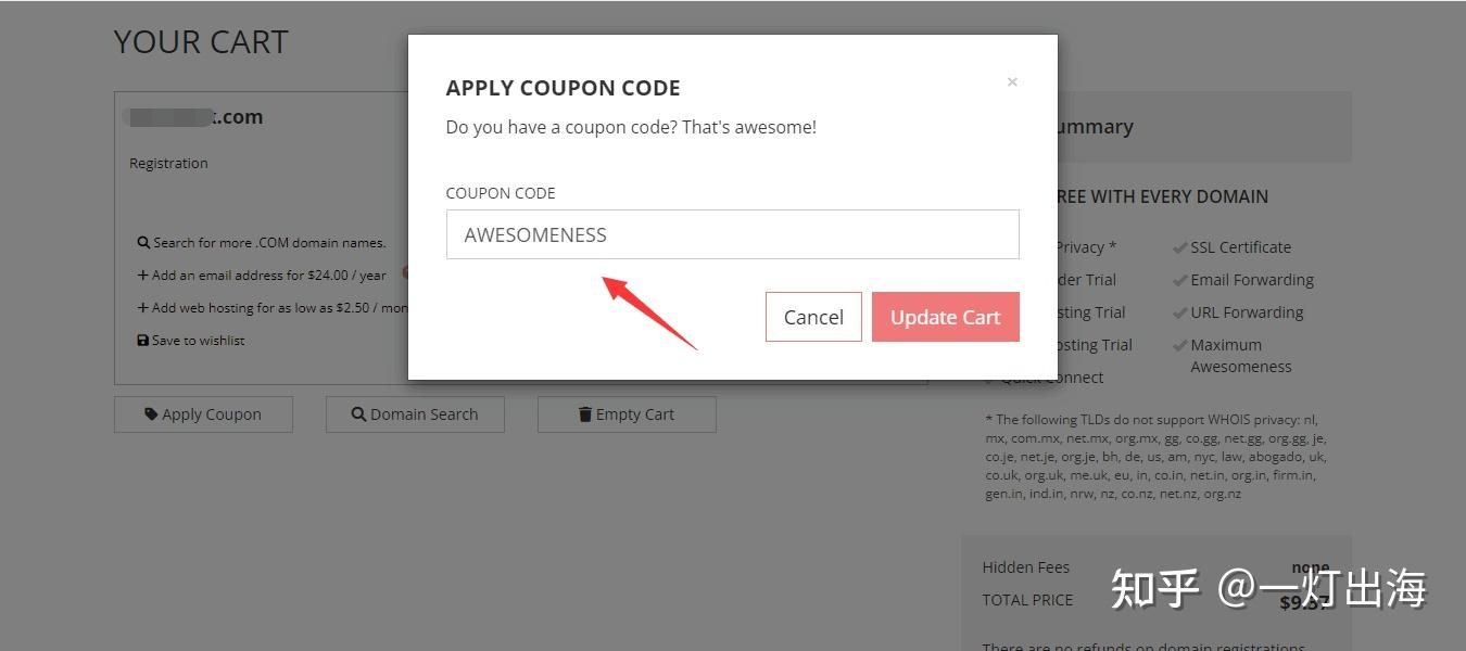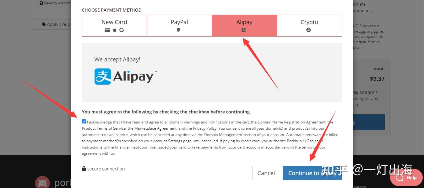 输入 Porkbun 优惠码:AWESOMENESS,可以节省一美元,但一个账号只能用一次,续费无效,确认无误后点击右下角的 Continue 按钮。