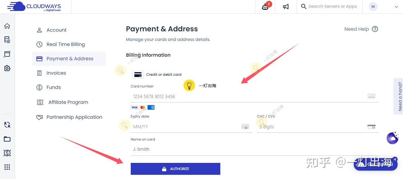 接下来,填写双币信用卡信息,授权Cloudways每月自动扣费。
