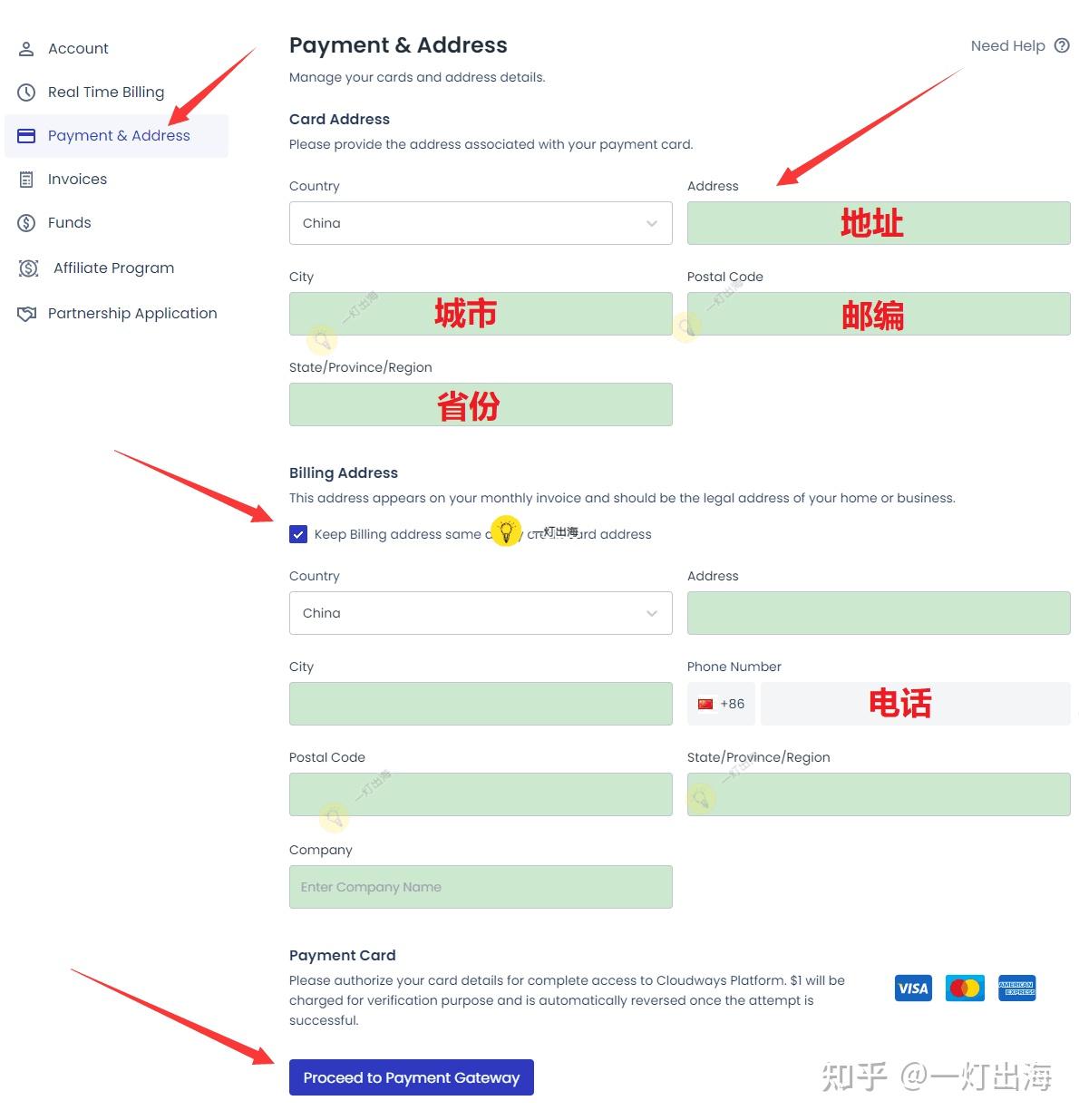 正常显示Payment & Address页面后,填写你的地址、城市、邮编和省份,并勾选Billing Address和上述地址相同,然后点击Proceed to Payment Gateway。