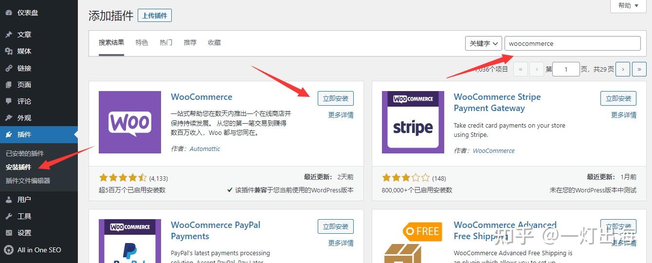 浏览器访问域名并在后面加上 /wp-admin,登陆 WordPress 网站,转到插件 > 安装插件,在搜索栏输入 WooCommerce,该插件会出现在搜索结果的第一个位置。