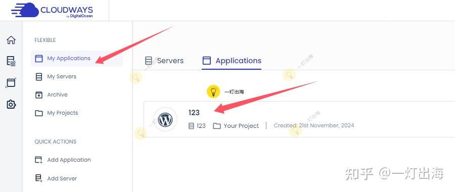 WordPress装好后,点击Cloudways左侧菜单栏第二个按钮My Applications,找到WordPress。