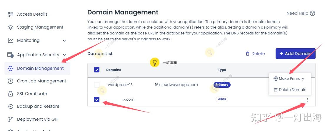 再之后,转到Domain Management,选中你的域名,点击它最右边的3个点图标,选择Make Primary。