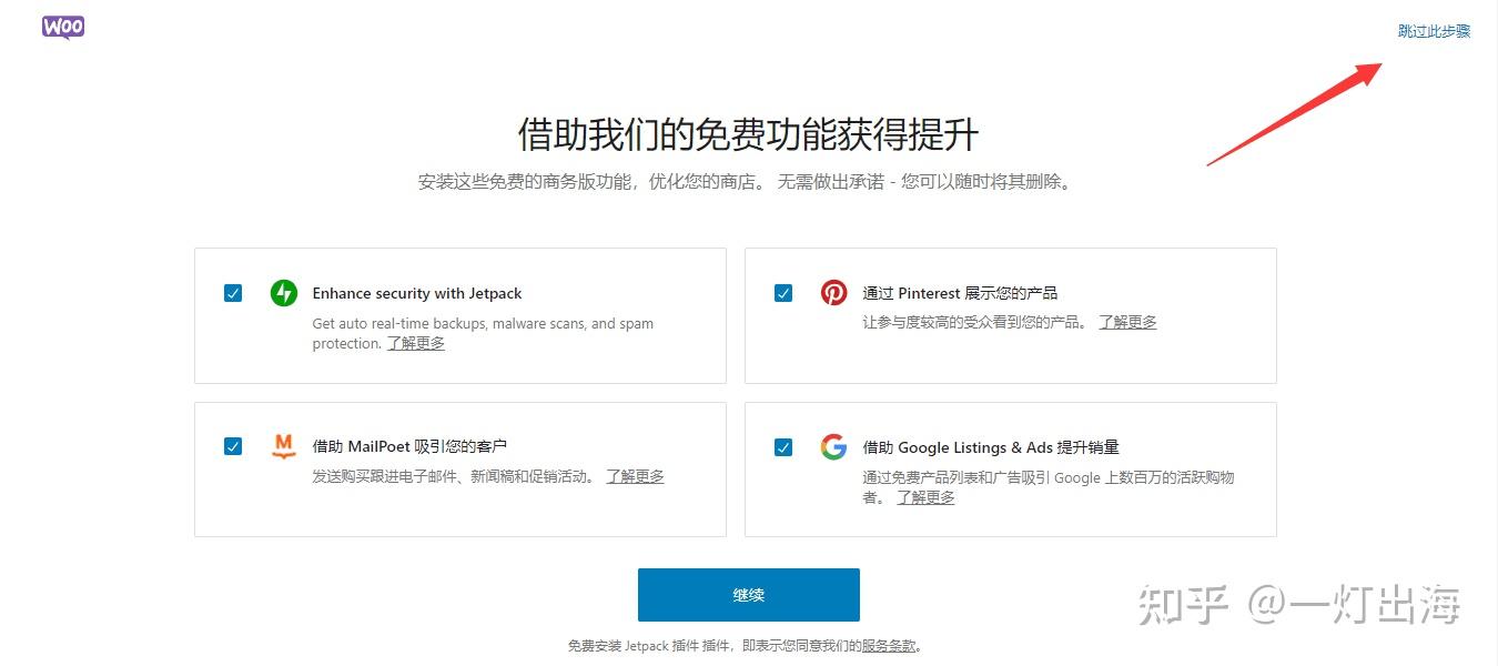 选择安装一些免费捆绑功能,但基本都不是必备的,可以点击右上角的“跳过此步骤”。