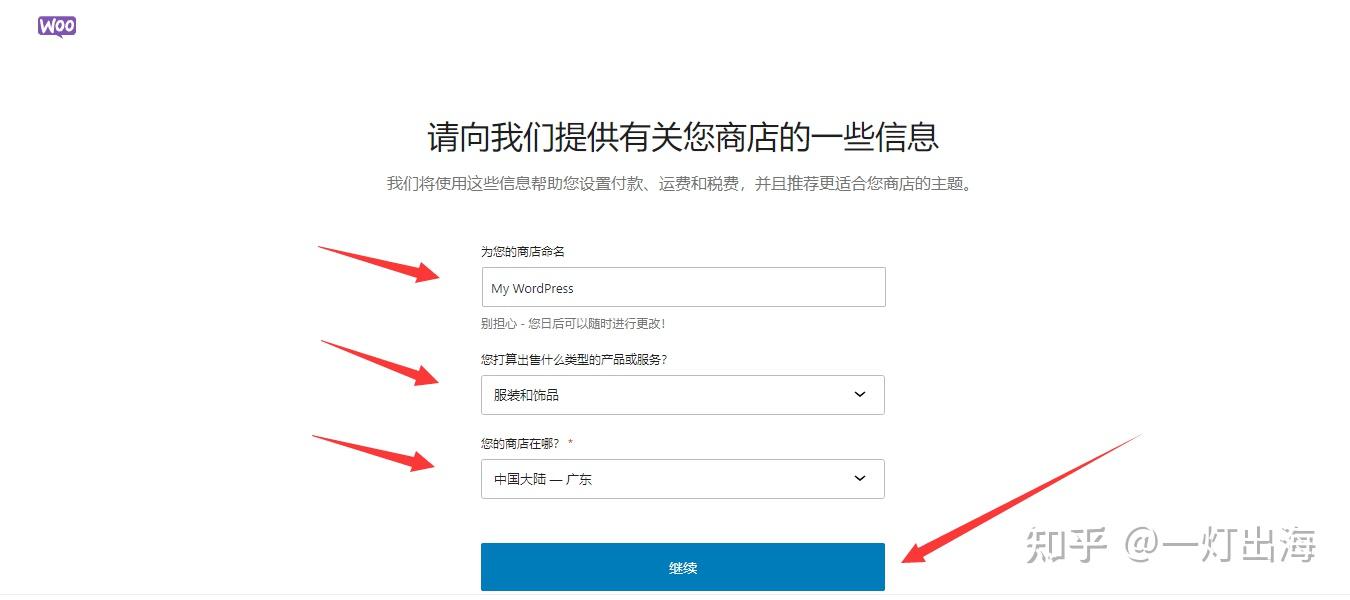 输入你的商店详细信息,包括商店名称,产品类型和商店位置,完成后点击继续按钮。如果你暂时不确定要选什么,可以先随便填,以后再修改。