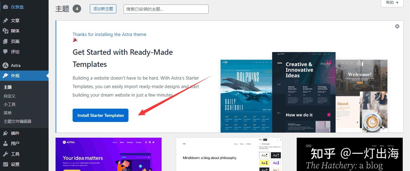 启用 Astra 主题之后,你将会看到下面的页面,请按照提示安装 Astra Starter Templates。