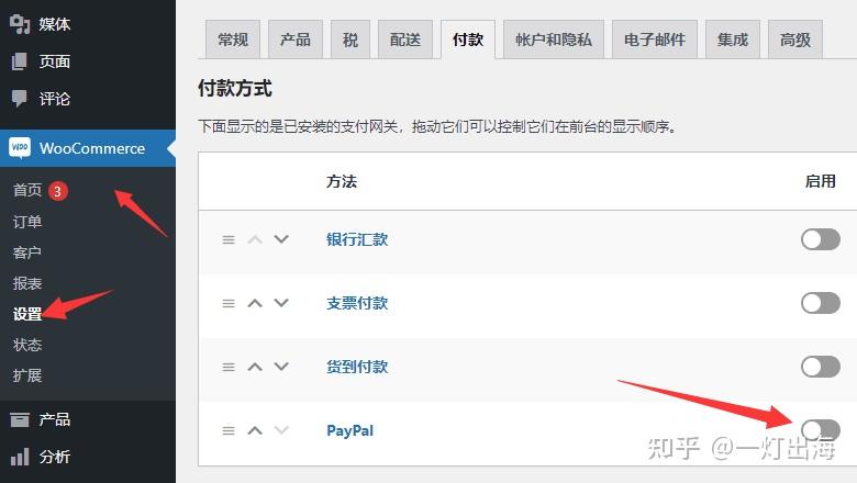 设置付款方式。转到 WooCoomerce 设置 > 付款。默认情况下,你可以选择银行付款、支票、货到付款和 PayPal,但做跨境电商独立站,请启用 PayPal 付款。